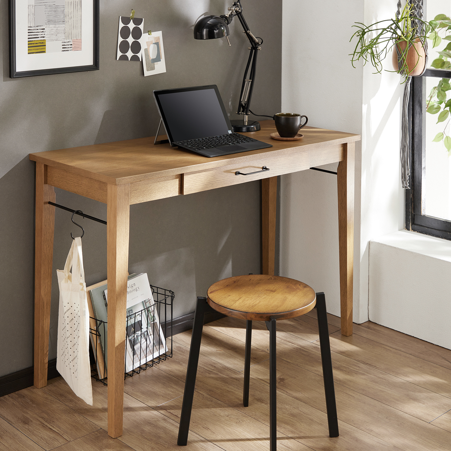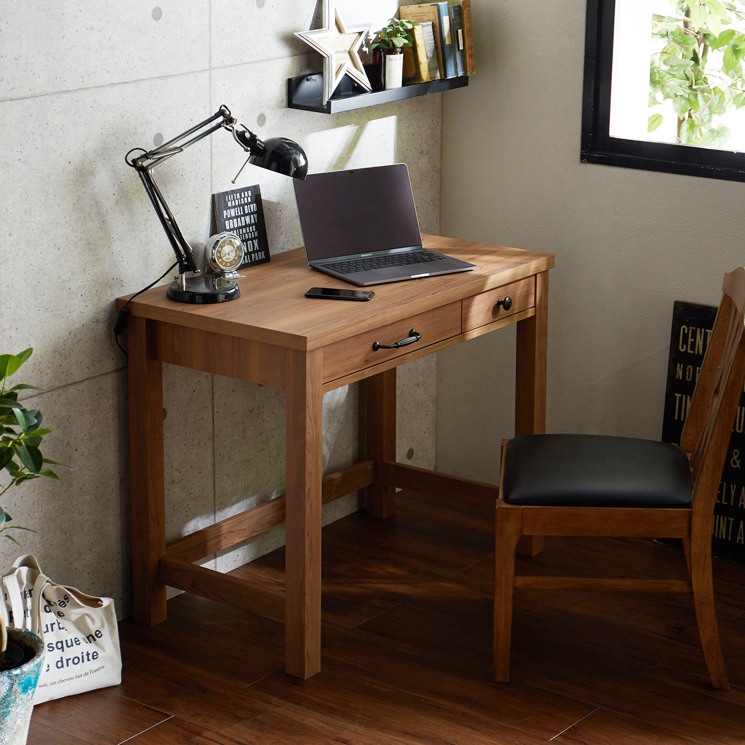 木目をしっかりと表現したプリント紙を使用ビンテージ感溢れる佇まいに仕上げた、おしゃれなワークデスク。ブラウン系のインテリアに馴染むデザインは、寝室、リビング問わず使えるのがGOOD2杯の引出しには異なる取っ手をあしらい、シンプルさの中にこだわりが光ります。抜け感のある脚部も角脚を合わせ、お求めやすい価格ながらもつくりはしっかりとしています。#PCデスク#テレワークデスク)