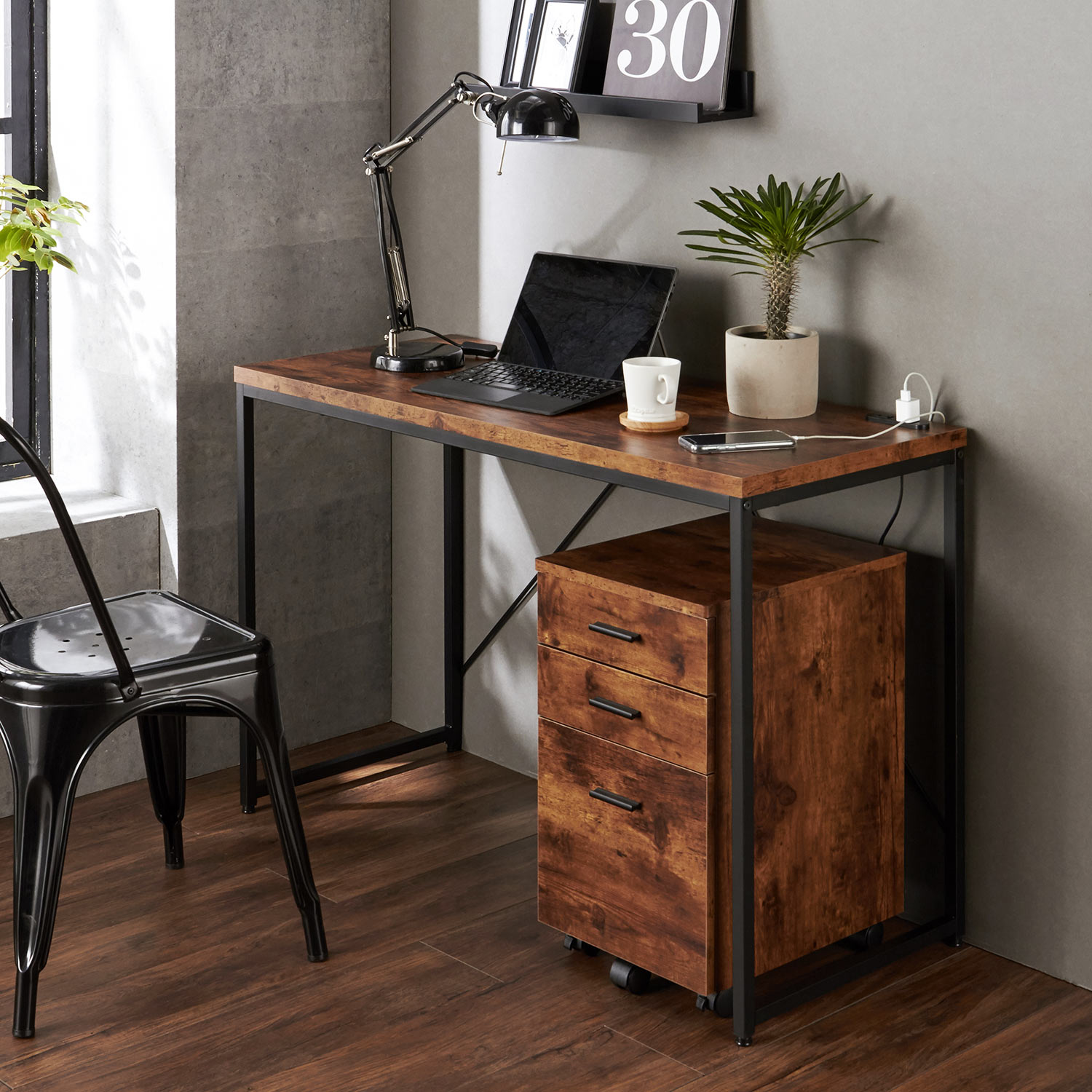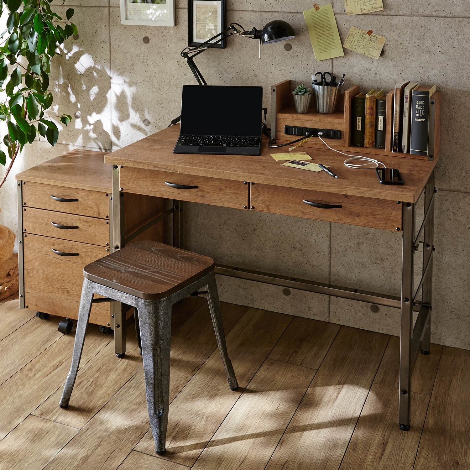天板は木目調塩ビ素材を使用天板上にはラックを備え、よく使うファイルや書類を収納OKまたラックには、スマホ充電やパソコンデスクとしても使えるようコンセント付き天板下の引出しは文具などのこまごまとした小物をしまうのに重宝します。スチールフレームには錆などリアルに表現した塗装