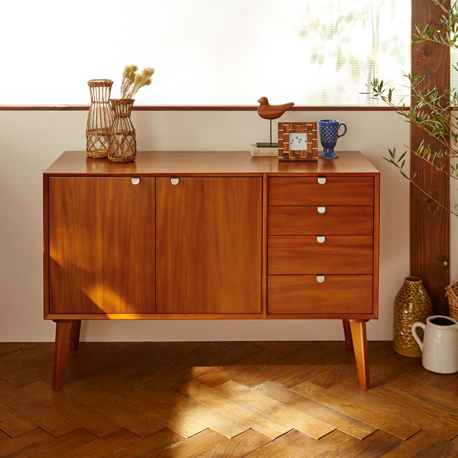 高級感のあるフィリピンマホガニー材を贅沢に使用フレーム部分には熟練の技である留め加工を施し、どの角度から見ても美しいシャープで立体感のある佇まいに仕上げました洗練された印象を与える、スチールの取っ手もおしゃれなポイント向かって左側には扉収納、右側にはしっかりとした箱組み仕様の引出しを4杯備え、収納性も抜群です脚部にはすっきりとした対角脚を合わせ、シリーズで並べた際も高さが揃うつくりの良さも魅力)