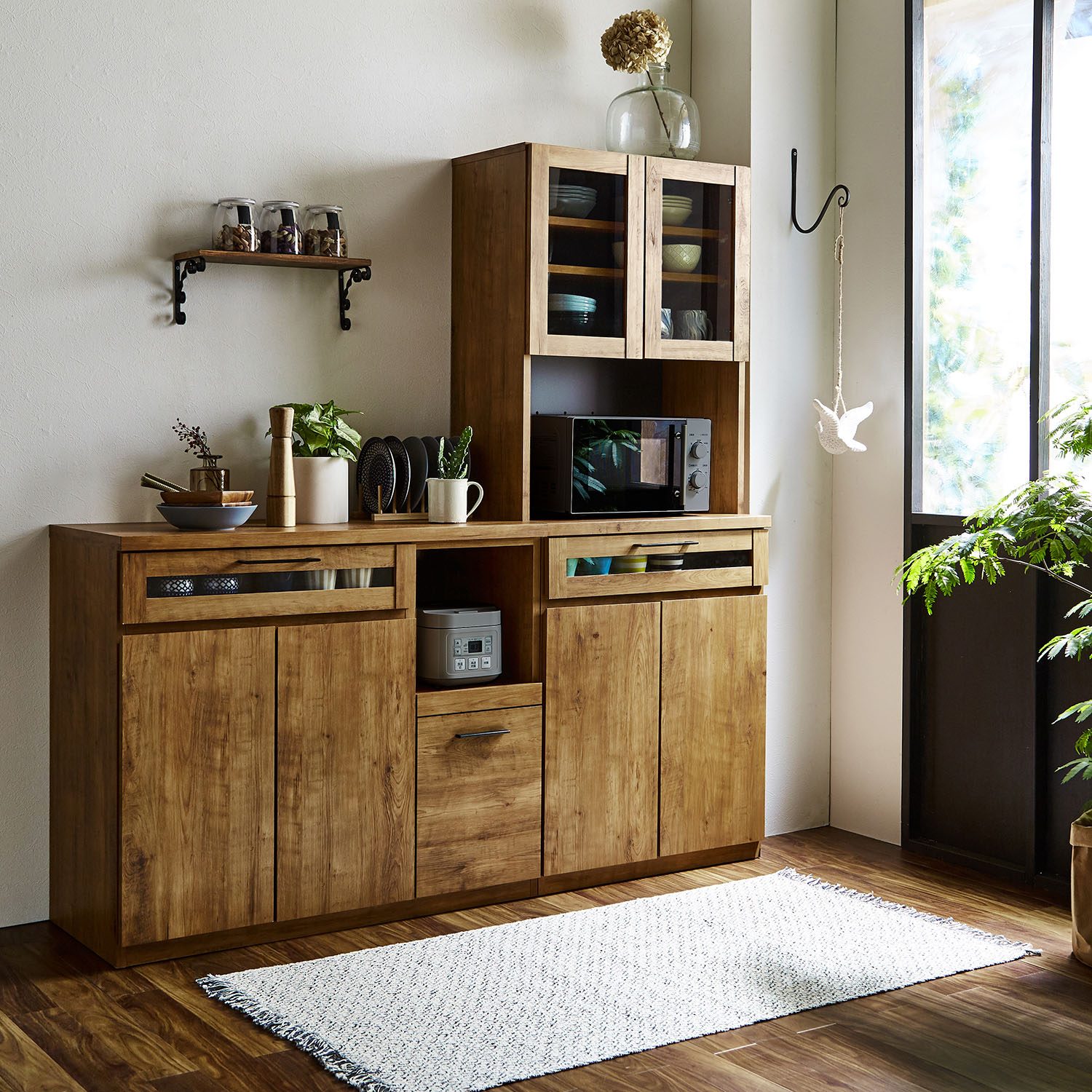 ビンテージ木目調シートを使用した、レトロなムード漂うキッチンボードお気に入りの食器などが映えるよう、背面のボードは落ち着いたブラックを採用見せる収納にこだわりたい方にもおすすめです前板とカウンター天板部分には、強化プリント紙を使用しているので、傷付きにくい仕様になっています。カウンター下の引出には窓があり、コーヒーカップやティーカップなどのコレクションをディスプレイして楽しめるのもポイントです引出は奥まで引き出せるフルスライドレール仕様で開け閉め楽々2口のコンセントも備えており、家電の設置も問題無し幅は70cmと、家電収納部や扉収納、引出が増えた105cmの2サイズご用意しています。)