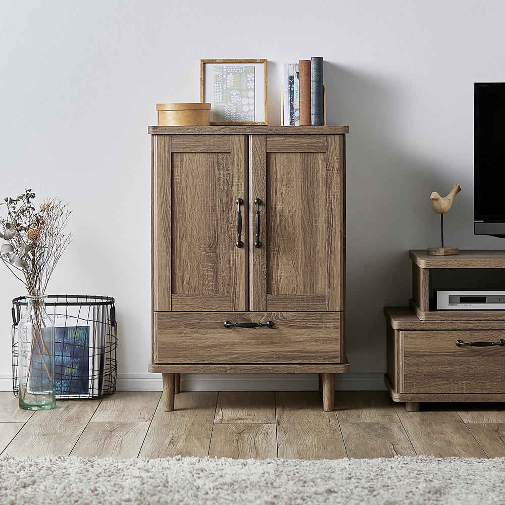 北欧デザインを取り入れたコンパクトサイズの家具シリーズ丸みのある脚部とブラックの取っ手で、甘くなりすぎない絶妙なデザインに3Dのシートを使用し木の質感を再現しました引出しと可動棚を有した扉の収納で、リビングからキッチンまで様々なシーンにマッチします。#リビングボード)