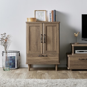 北欧デザインを取り入れたコンパクトサイズの家具シリーズ丸みのある脚部とブラックの取っ手で、甘くなりすぎない絶妙なデザインに3Dのシートを使用し木の質感を再現しました引出しと可動棚を有した扉の収納で、リビングからキッチンまで様々なシーンにマッチします。#リビングボード)