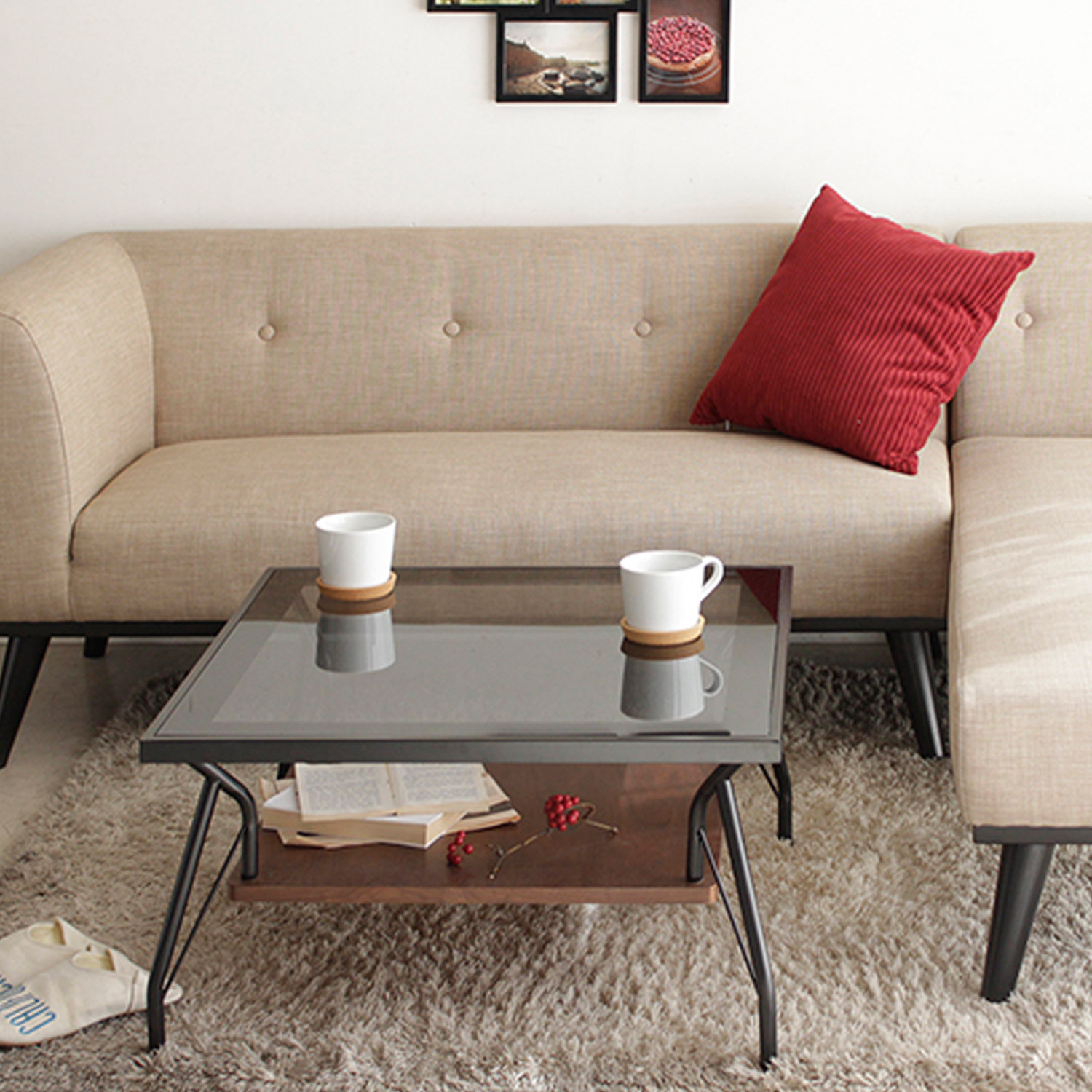 女性的で美しい、なめらかな曲線を見せる脚部が素敵グレーガラス×木棚×スチール脚でバランス良く、高級感のある佇まいに仕上げたリビングテーブル。ガラス天板から見える木棚には、美しい木目が魅力のウォルナット材突板を使用見た目だけでなく、リモコンや雑誌のチョイ置きもできる、使い勝手の良いつくりになっています。「正方形」と「長方形」の2サイズから、お好みでどうぞ)