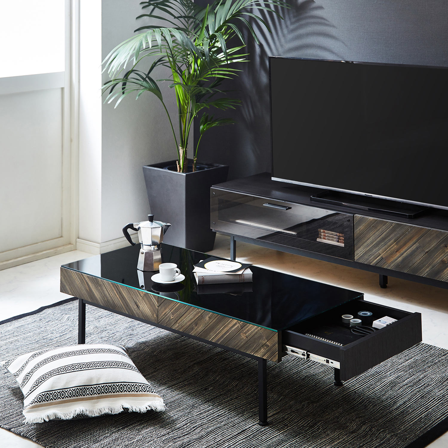 落ち着きのある色合いと素材の良さを活かしたリビングテーブル引出し前板にはシャビー感のある塗装で仕上げたアカシア無垢材を使用斜めに木材を配したニュアンスを楽しめるおしゃれなデザイン天板にはブラックの強化ガラスを用い、高級感のあるインテリア空間を演出することができます。引出し1杯付きで、テーブル上をいつでもすっきり片付けOK脚部にはスタイリッシュな印象を見せるスチール脚を採用シリーズのリビングテーブルと揃えるのがおすすめ)