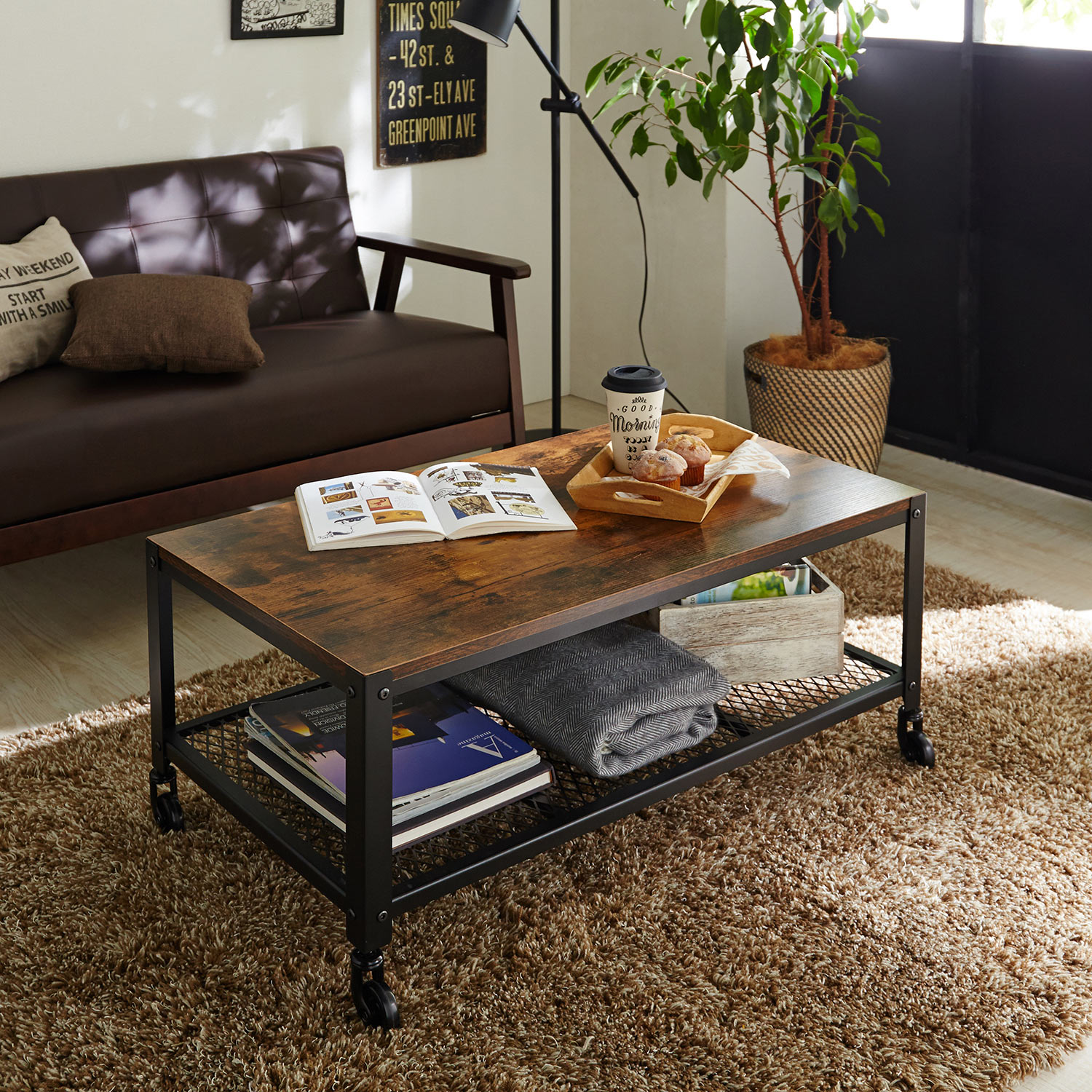 黒のスチール×荒々しい木目調のシートがメンズライクでカッコいいリビングテーブルキャスター付きで移動しやすく、お掃除もラクチン。天板下の棚にたっぷり物が収納できるので、天板はすっきり片づきます。スペースに合わせて2サイズをご用意しましたお買い求めしやすい価格もポイント。)