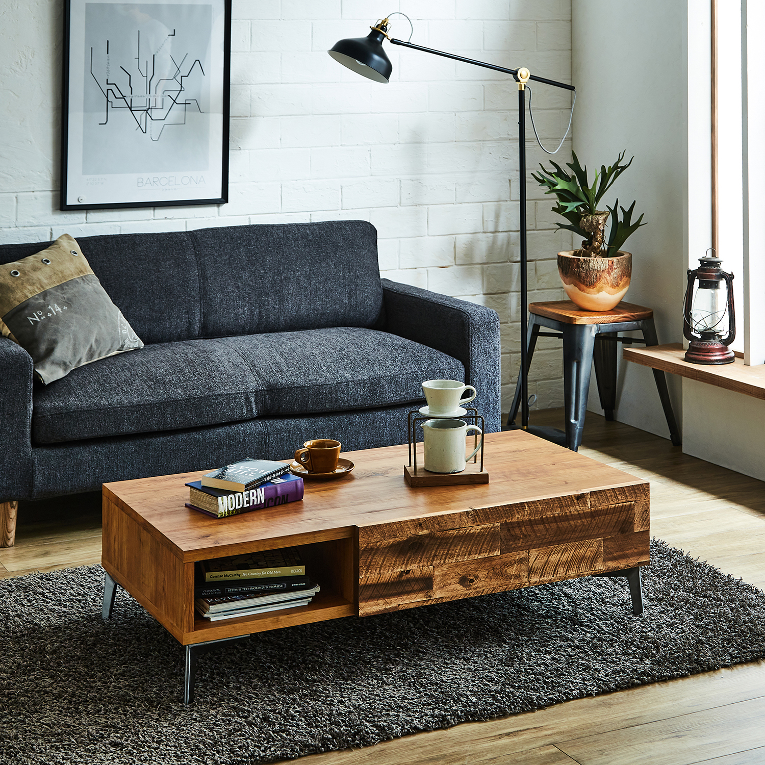 ブルックリンスタイルのコーディネートが叶うリビングテーブル引出しの前板はアカシア無垢材の凹凸と木感を引き立てるオイル塗装で、DIY風のおしゃれなデザインに仕上げています。軽やかな印象を見せるスチール脚のあしらいもデザインポイントリモコンなどをサッとしまえるオープン棚+引出しを備えたつくりで収納性も◎ビンテージ感のある家具と揃えて、統一感のある空間を演出するのもオススメ)