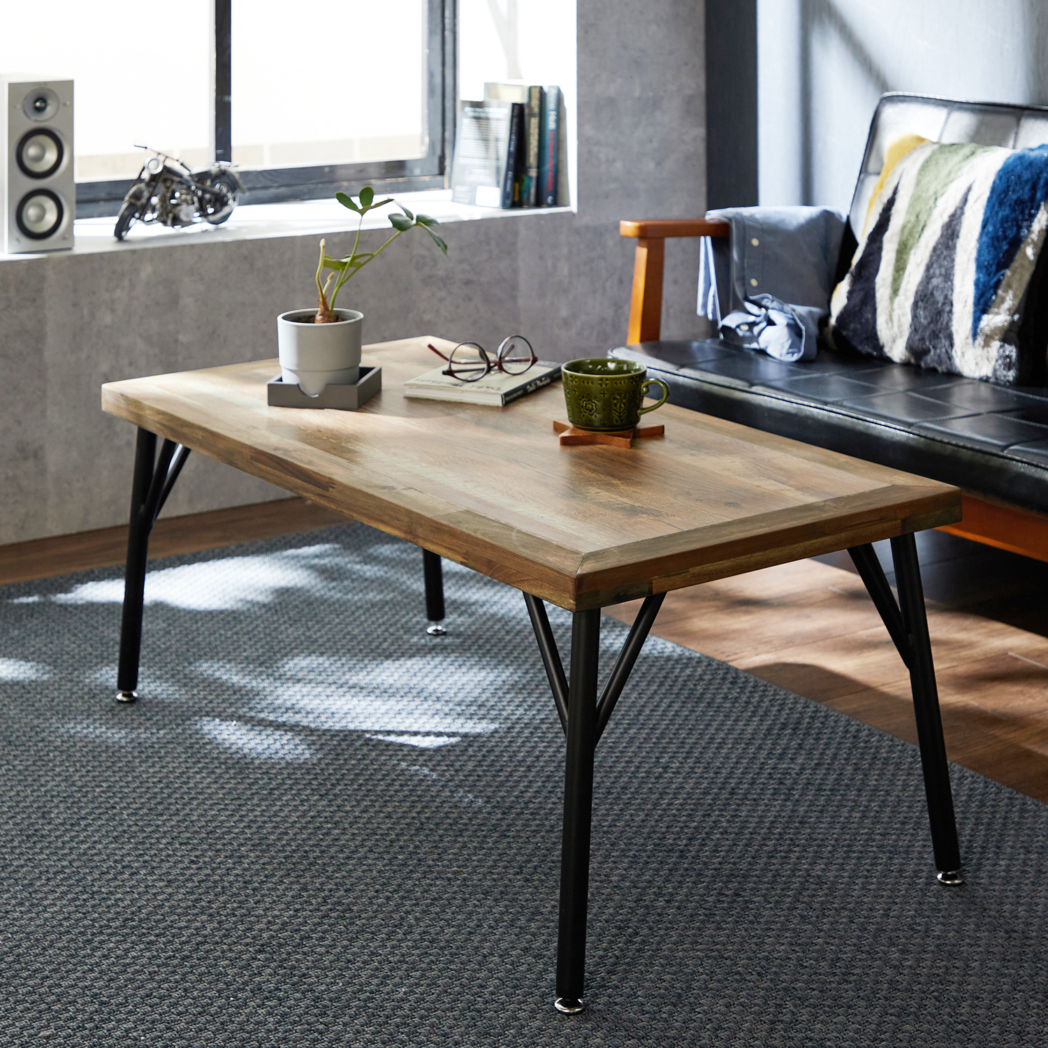 木目の流れを楽しめるオーク材を使用した天板にビンテージ感をプラスブラックのスチール脚を合わせ男前な雰囲気に仕上げた、リビングテーブル。スタイリッシュさを見せる細みの三角フォルム脚が、今風インテリアにベストマッチ一人暮らしのお部屋に置けるサイズ感も魅力。)