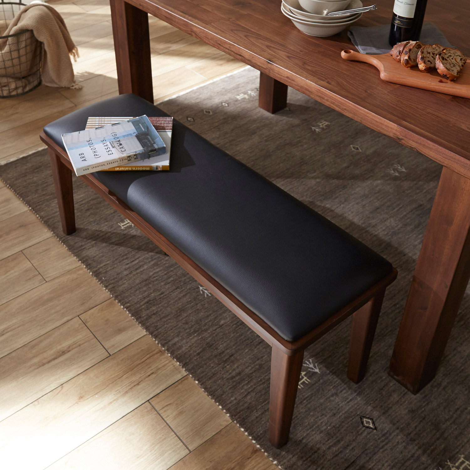美しい木目と落ち着いた色合いで、存在感をただよわせるダイニングベンチフレームには、天然木のぬくもりを感じさせるウォルナット材を使用しました木の質感が際立つよう、フレームを座面よりひと回り大きくデザイン座面の素材には合成皮革を使用しているので、汚れてもサッと拭けてお手入れが簡単です黒の座面とブラウンのフレームの組み合わせが空間をシックに演出同シリーズのダイニングテーブルやダイニングチェアとコーディネートすることもできます。