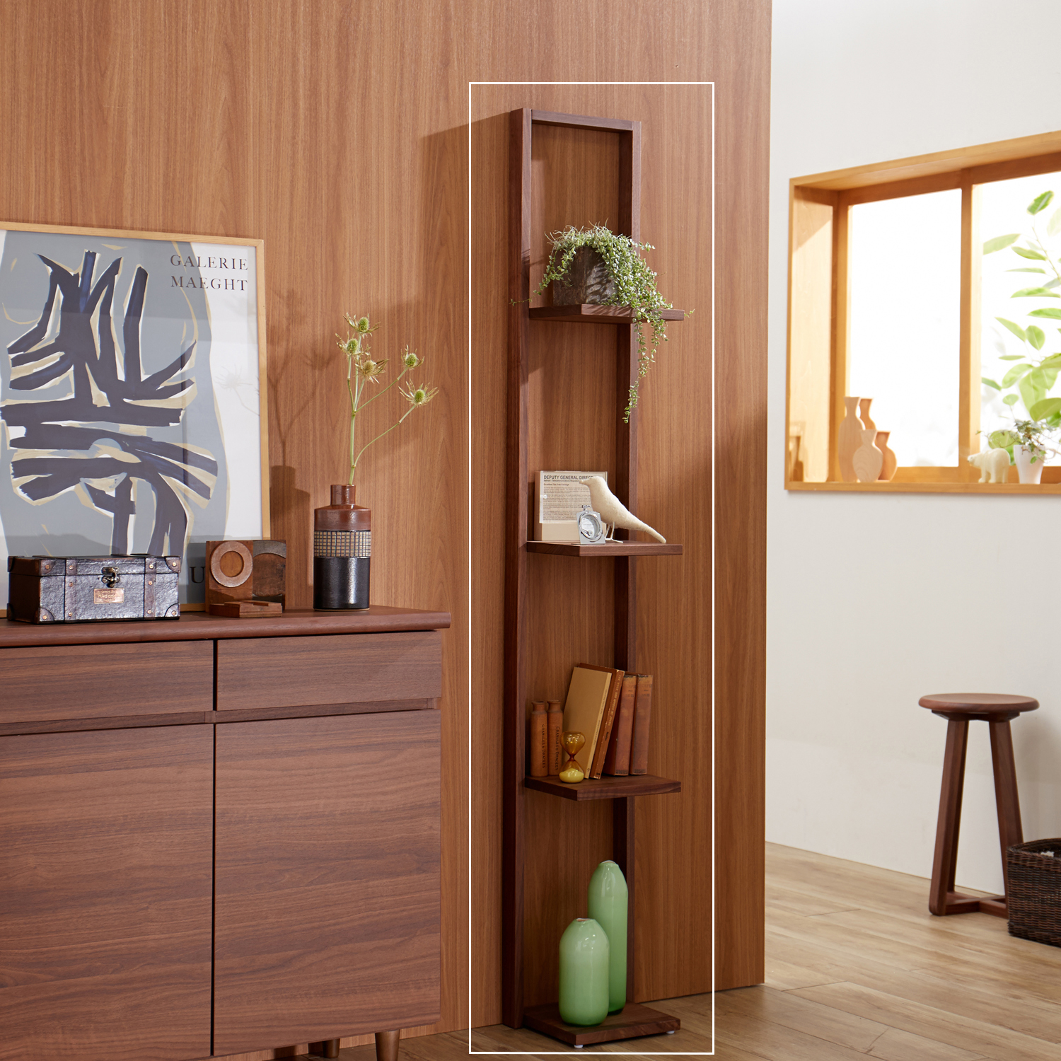 素敵な風合いのウォルナット材を贅沢に使って、ナチュラル感たっぷりに仕上げたオープンラックごくシンプルなデザインが木目の美しさを引き立てています。上から下に向かって奥行が深くなる安定感のあるフォルムで、上段が薄いから高さのわりに圧迫感もなし最上段・中央・最下段の棚奥には転び止めをほどこしています。金具の色や背面の仕上がりまでこだわった丁寧なつくりモダンなお部屋や落ち着いた北欧調、レトロテイストなど幅広いインテリアにマッチします。
