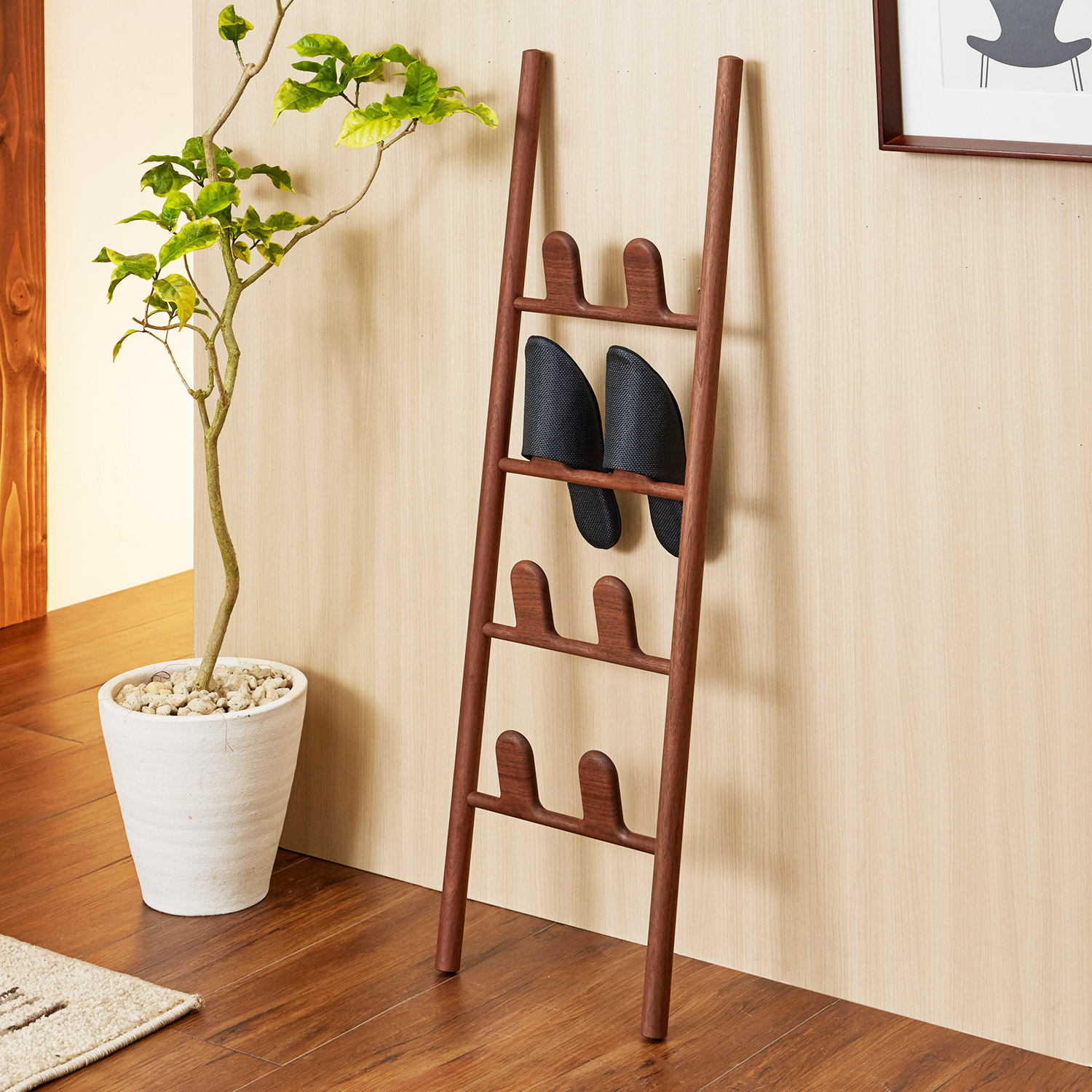 天然木やその端材を大切に使い、製造から研磨作業までを丁寧に手がける北海道・旭川の家具メーカー「cosine(コサイン)」より美しい木目とシックな色合いを持つウォルナットの無垢材で仕立てたスリッパラックシンプルなデザインに素材感が映え、上質な雰囲気をただよわせます。スリッパを掛けた時も、掛けていない時も美しいたたずまい立て掛け式なので場所をとらず、玄関のスペースを有効に使えます。壁と床面に接する部分には、それぞれすべり止め付き深みのある魅力的なブラウンカラーで、スタイリッシュな玄関に華を添えます。
