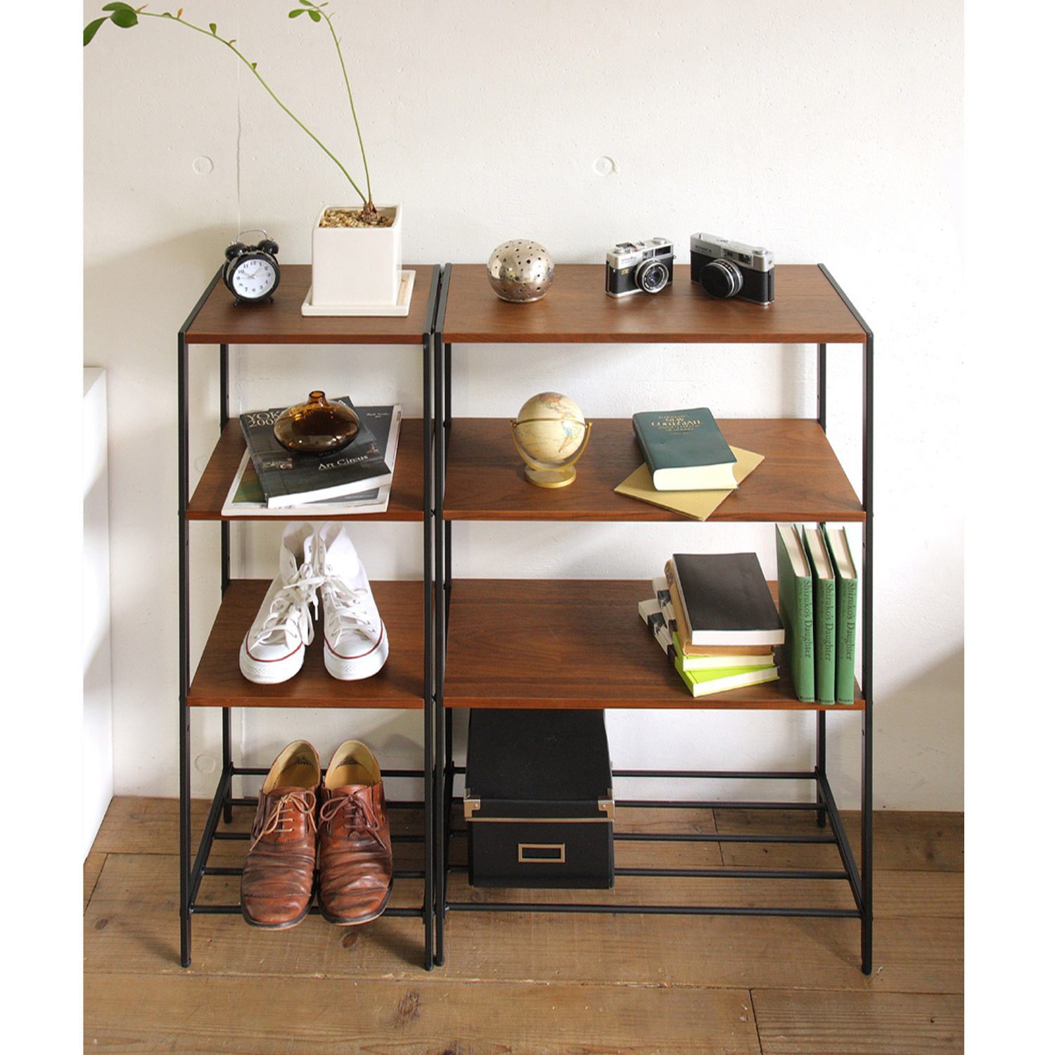 木目の美しい天然木ウォルナット材の突板を棚板に使用スチール素材を使った黒のフレームとの組み合わせが、落ち着いたモダンスタイルを演出します。最下段はスチール棚で、見た目もスッキリした印象にすき間に置ける「幅35cm」タイプと、リビングの中心で見せる収納も楽しめる「幅60cm」タイプをご用意しました