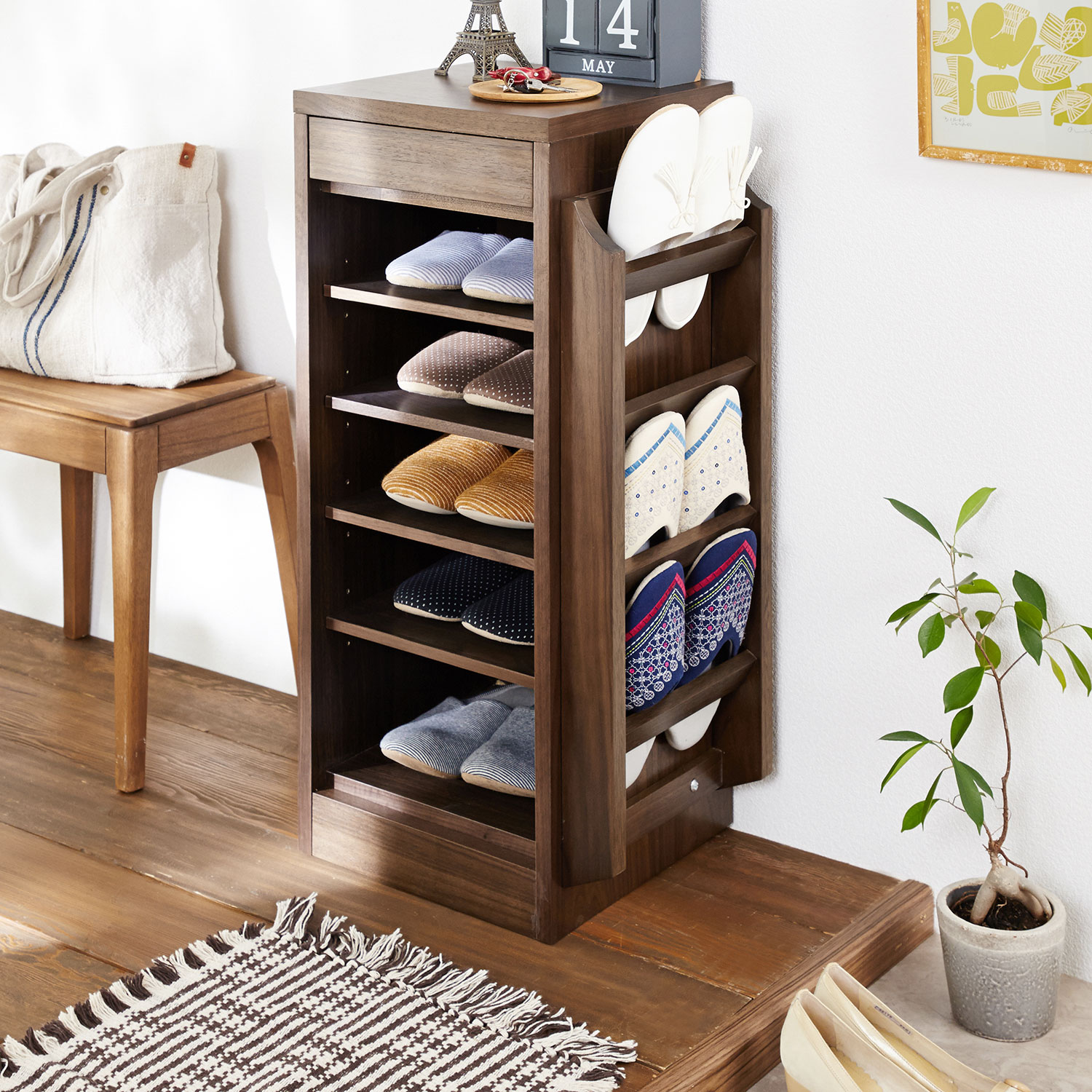 落ち着きのある色味と美しい木目が魅力のウォルナット材を使用玄関スペースにしっくりと馴染むスリッパラック。サイドにもラックを備え、たくさんのスリッパを収納可能棚板は3cmピッチで高さ調節OKハンコなどをしまえる引出し付きで収納性もGOOD