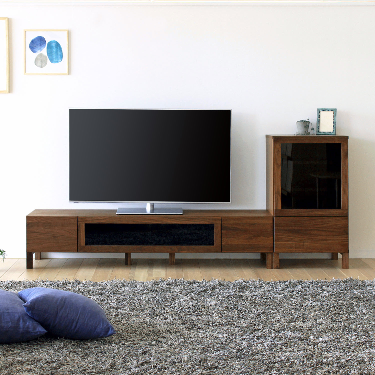 シンプルで飽きの来ないデザインデザインが特徴のレッチェシリーズ前板に天然木ウォルナット無垢材を使用し高級感のある佇まいガラス扉の蝶番はゆっくり静かに閉まるダンパー式引出しはフルスライドレール使用。DVDやCD、取扱説明書などすっきり収納しておけます。テレビ台のサイドボード・チェストとしても、単体でリビング収納としても活躍【