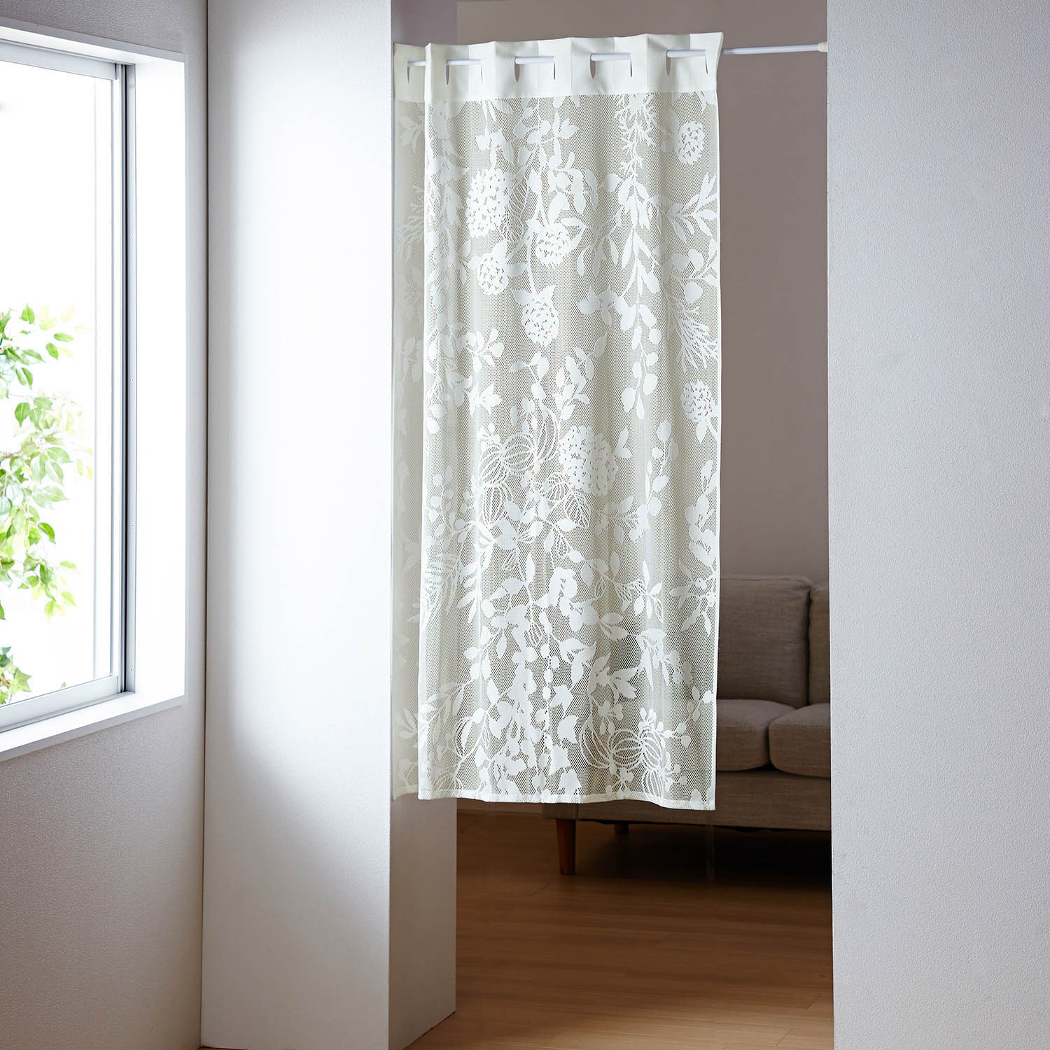 [nekonekodesign PAPER ARTS] 繊細な植物モチーフを切り絵風に表現光の透け方が美しい間仕切りにも使用できるスタイルカーテンですモチーフによって編み方や密度を変えているので、光に透けると立体感が感じられるデザインになっています。穏やかな秋のイメージに似合う柔らかなオフホワイト全体は、秋の実を描いたような1枚の絵千趣会とデザイナーのコラボ、ここだけのオリジナルです突っ張り棒を通す部分は、折り目付きで折りたたみやすい仕様テレワークや在宅勤務(オンライン勤務時)の目隠しとしてもおすすめ窓辺や間仕切り使い、のれんとしても使えます。玄関口に吊るすことでドアを開けた際の目隠しにもなります。